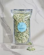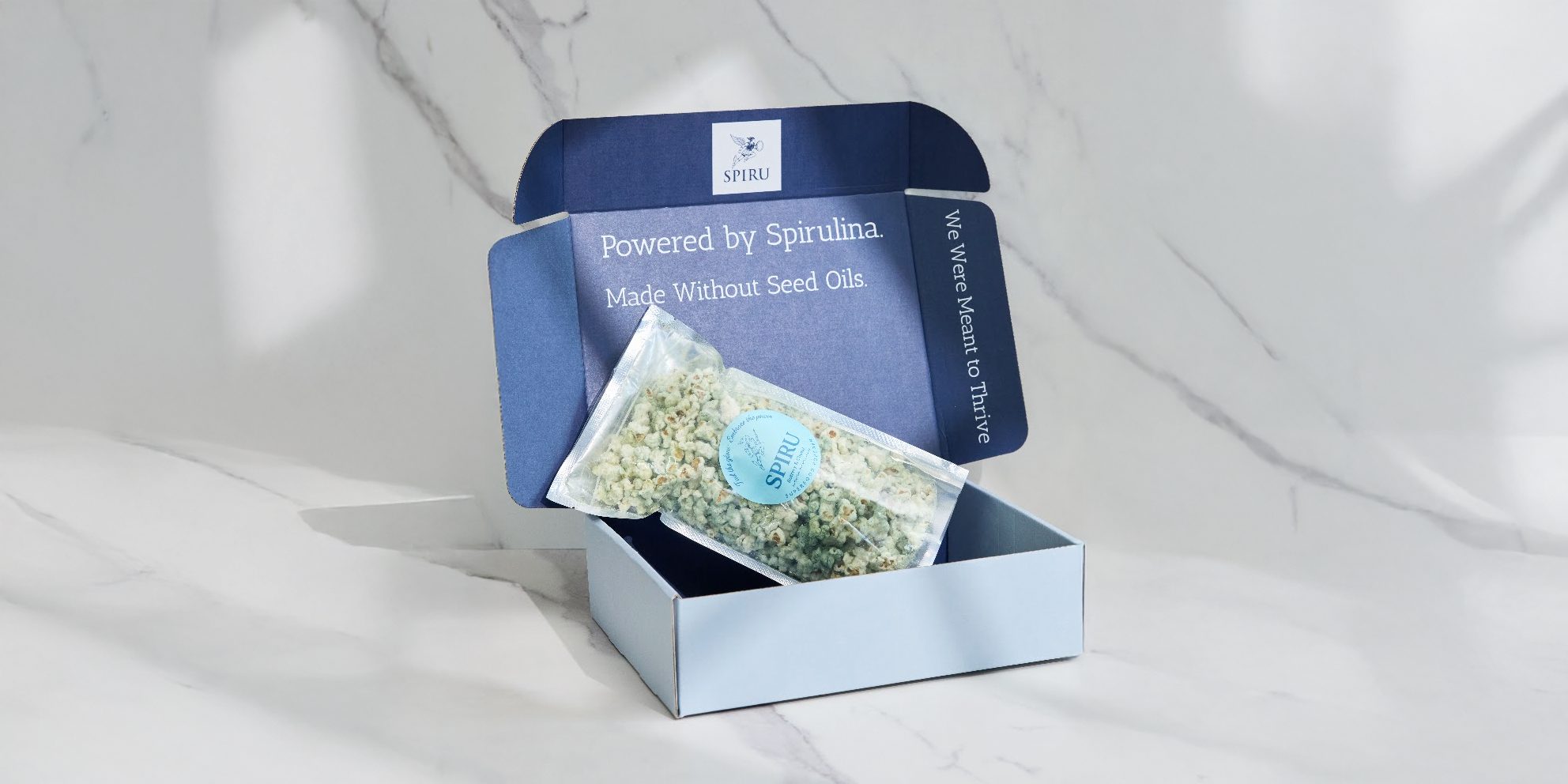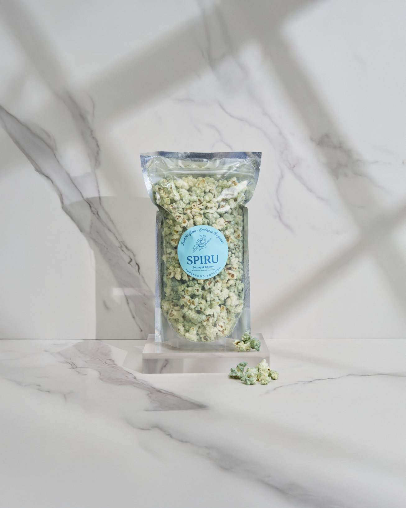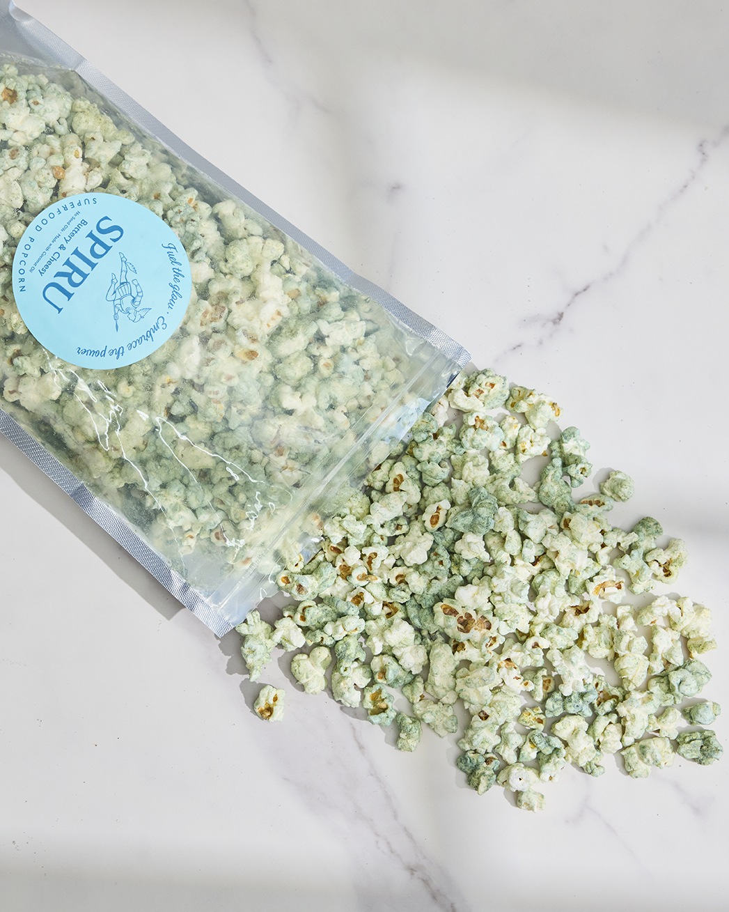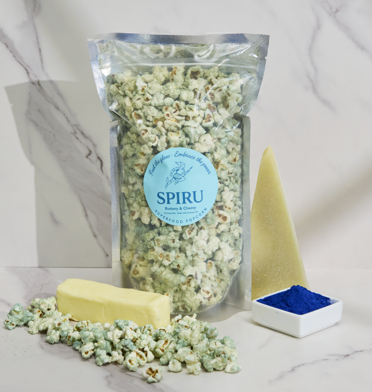 A spirulina-powered popcorn made with coconut oil, real cheese, butter, and no seed oils.
